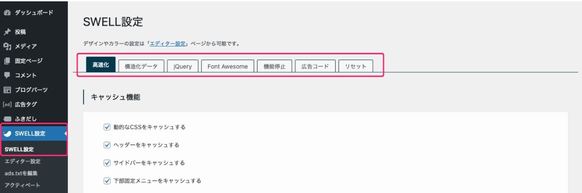 SWELL設定では、テーマ特有の機能を最大限に活かすための調整・設定を行います。